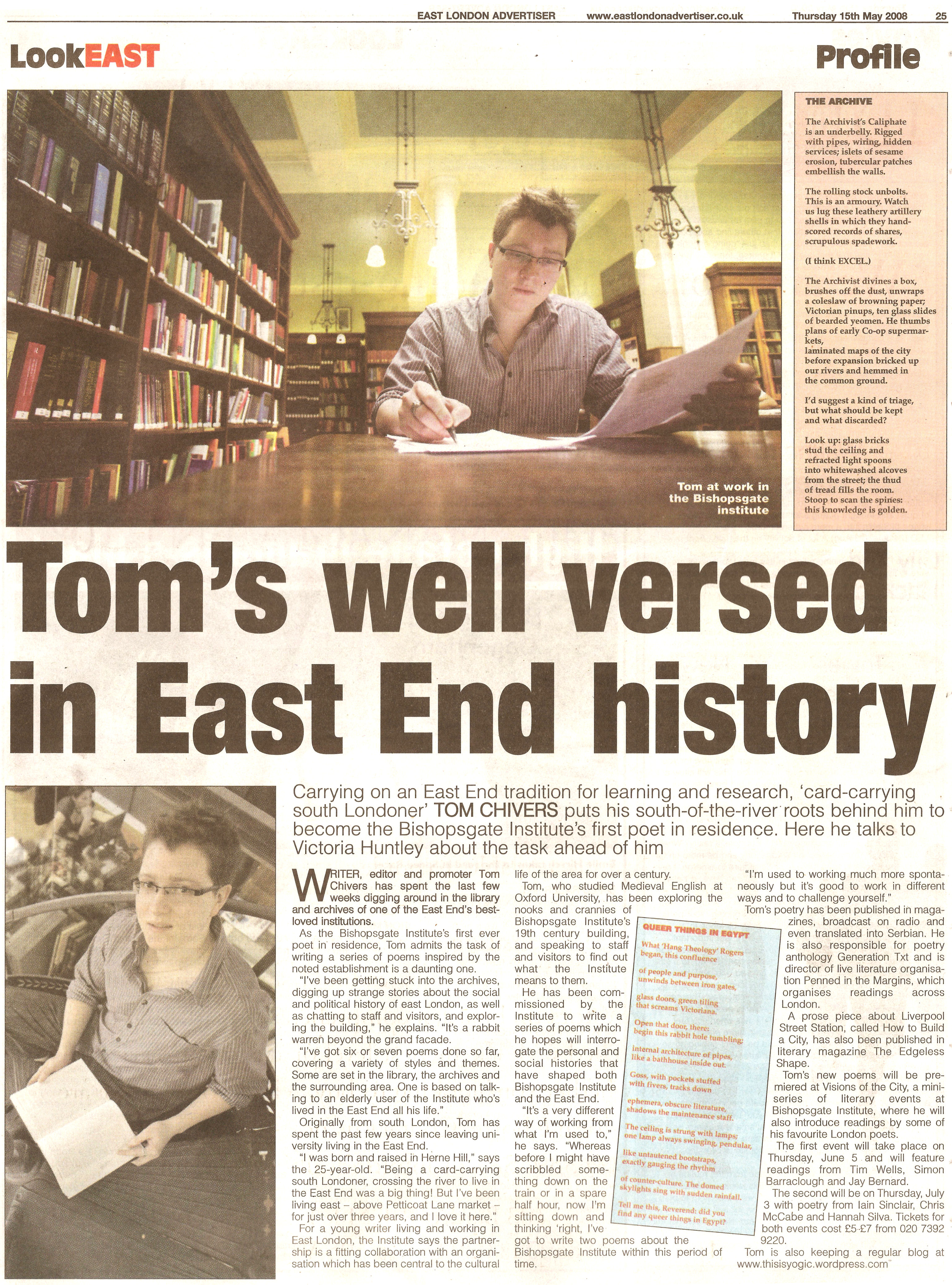 Fame at last! The East London Advertiser have published today a full-page article about my residency at the Bishopsgate Institute. The article, by Victoria Huntley, includes two poems, ‘The Archive’ and ‘Queer Things in Egypt’.
