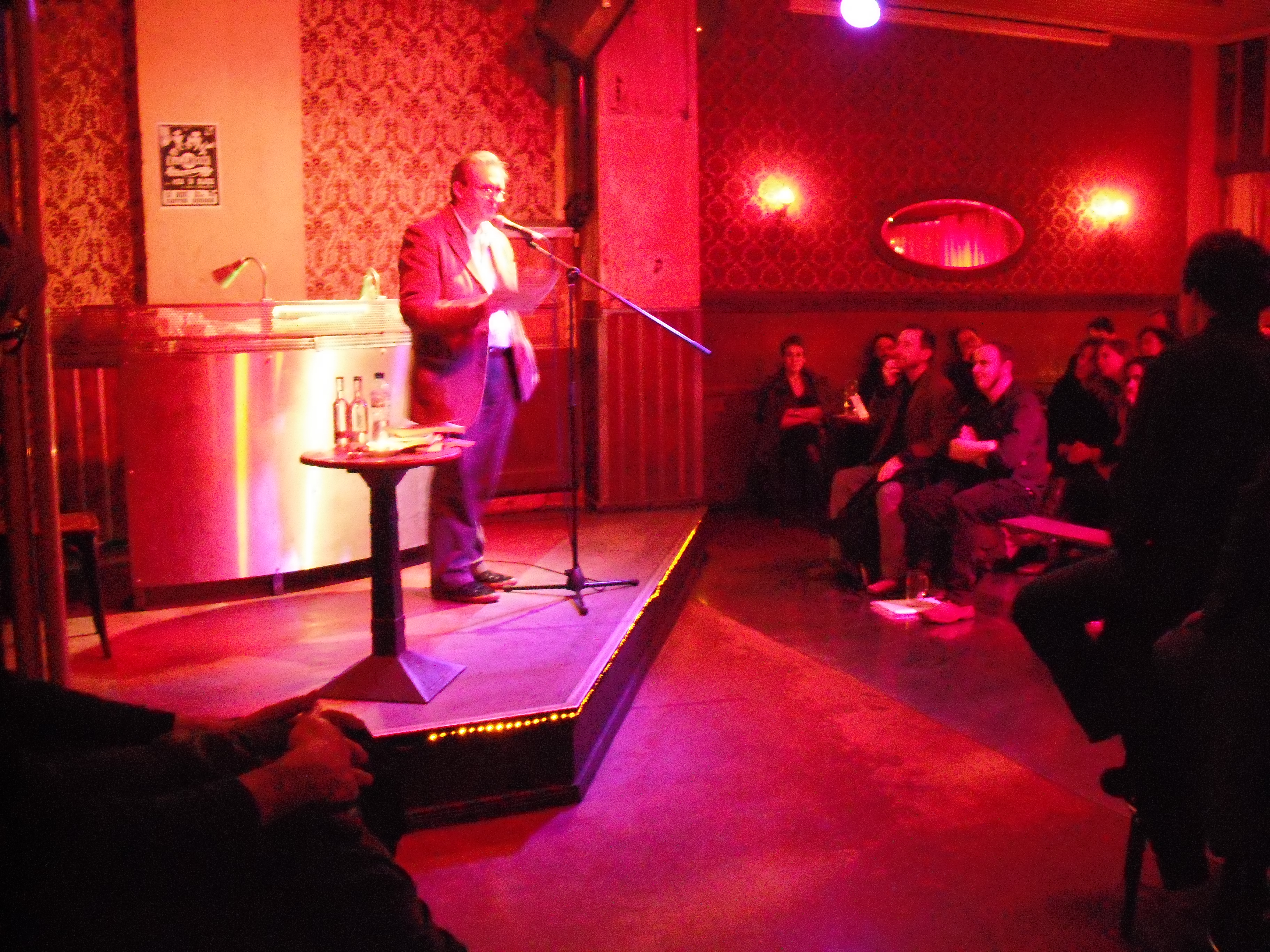 Get to the venue at 7pm. Marginally fewer people there tonight but still a good buzz. Pre-match nerves. Sit with the lovely Hannah Silva, both rifling anxiously through bits of paper. Sarah gets drinks from the bar, where she coincidentally bumps into an actor from the Globe theatre, where she works, on holiday. Turnbull is back, tonight dressed to the nines. I’m up first. Compere Michael Haeflinger, an American emigre with a German name, introduces me as ‘the busiest man in London poetry’ or something like that. As I write this meandering blog post, it doesn’t feel like it at all.