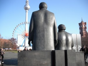 It’s basically one long road into the centre of the city, passing Torstrasse, Alexanderplatz with its looming TV tower, and crossing the River Spree (twice). We check out a statue of Marx and Engels in a park. Someone has scrawled on its base LE KAPITAL C’EST FUN, LE COMMUNISME C’EST NUF. I keep overhearing conversations in German and thinking I know what they’re on about. It’s something to do with the rhythms of the language. Also, I’ve studied Anglo-Saxon, and can sort of read quite a lot of basic stuff like place-names.