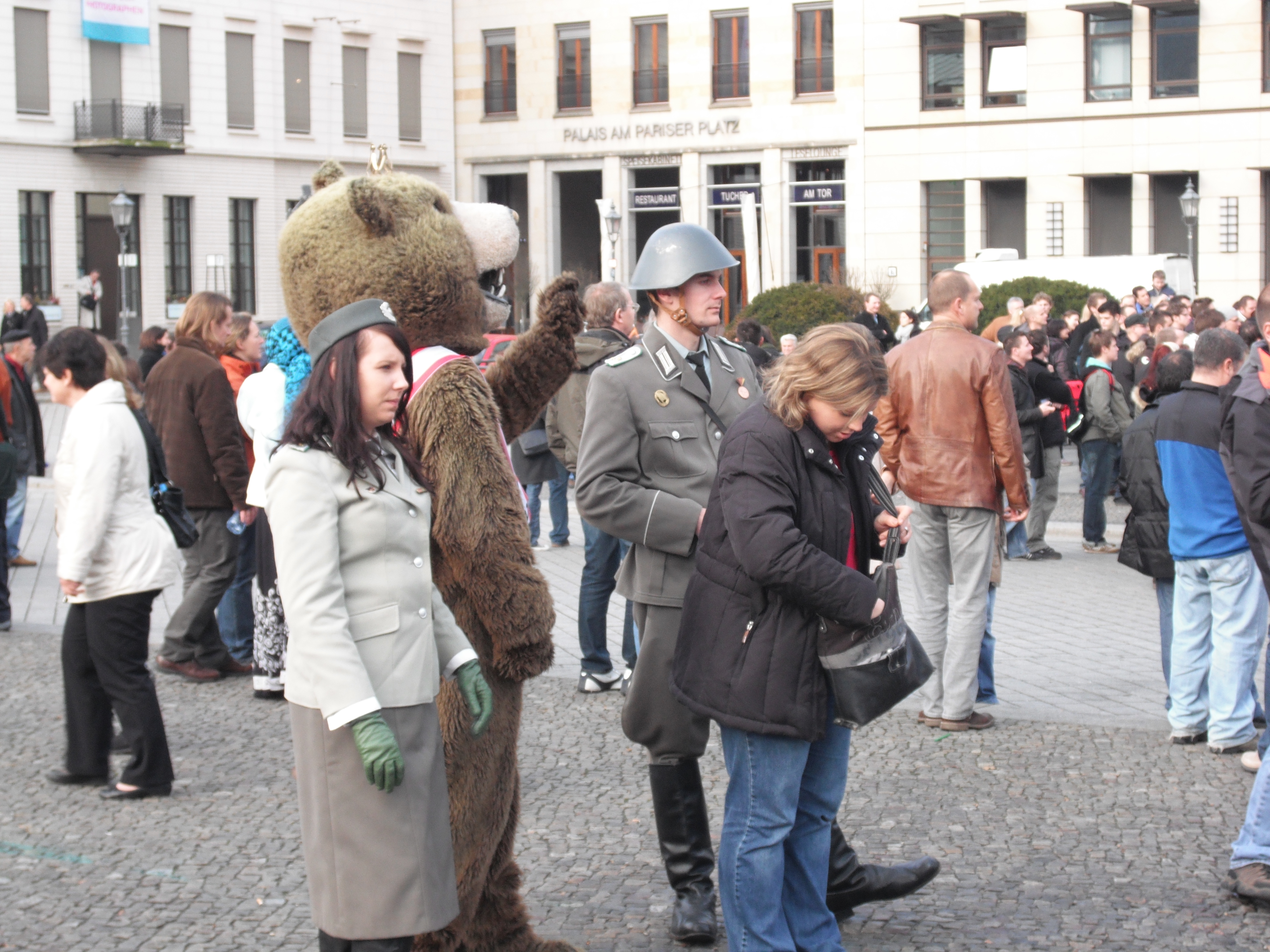 At the end of Unter der Linden is the Brandenburg Gate. Wow. But also – presence of actors in SS uniforms, that’s strange. American embassy. HUGE flag. And what’s this? German B boys entertain the crowds as we pass beneath the huge gate itself and find out more about its history from some excellent trilingual noticeboards. I learn a lot, how the Gate was built as a celebration of peace, subsequently became a symbol of Prussian imperial power, then of Nazi power, and finally, post-war, it came to represent a divided city.