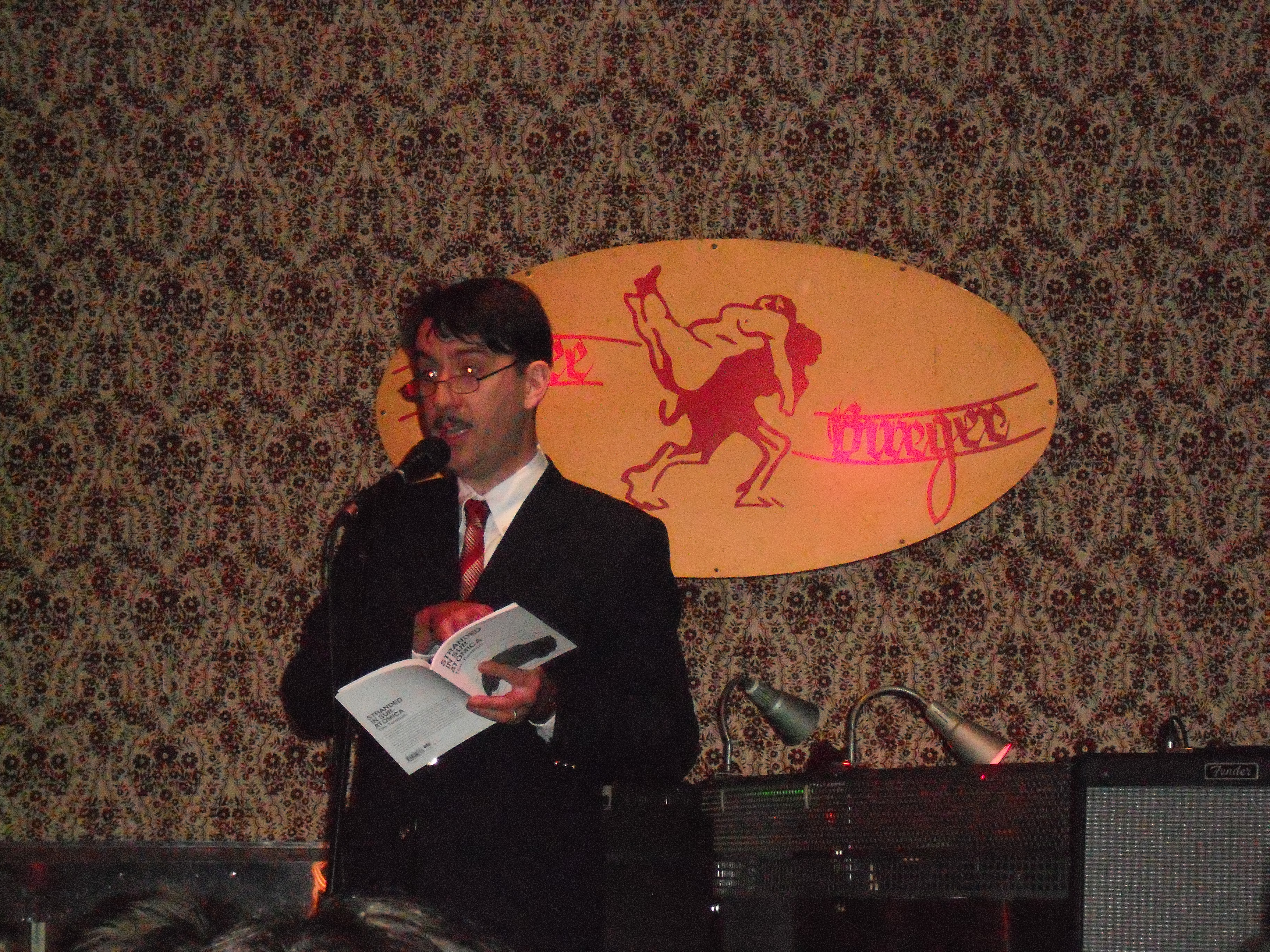 Kaffee Burger is situated on Torstrasse, which I have been reliably informed is the Shoreditch of Berlin. Some signs of this: messenger bags, graffiti art, design agencies and jagged haircuts. Also, lots of Turkish cafes, so perhaps more the Dalston of Berlin? Anyway… we grab some dinner first at a nearby Italian restaurant where we don’t even have to open our mouths before they greet us in English, then to Kaffee Burger, which is a lovely little bar with several rooms and a low stage and crumbling walls and the like. Friendly staff who resist the urge to patronise me when I stumble through some insulting impressions of their language to order drinks. We are met by Catherine Hales, organiser of the festival, who is lovely and welcoming but obviously a bit anxious – it being the first night. As an events organiser, I empathise and grab a seat after saying hello to poet and founder of the festival Alistair Noon, Tim Turnbull who has come with his wife (like me, although Sarah and I are living in sin), and a few new faces.