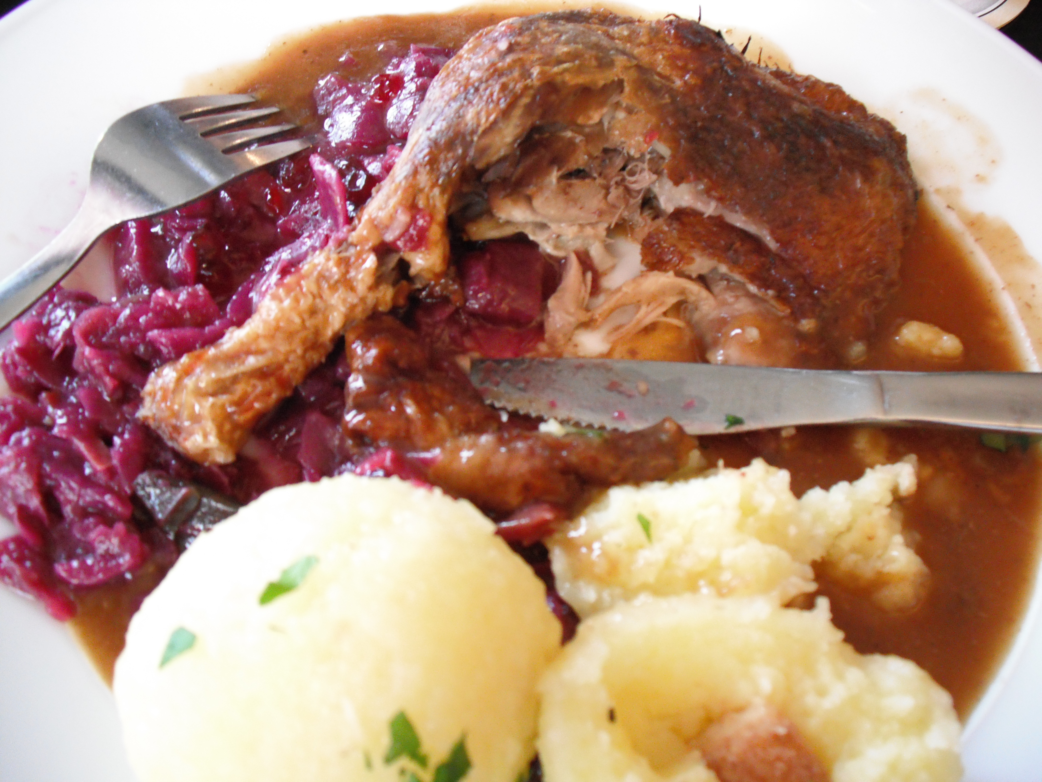 Duck! Red cabbage! Dumplings! White wine! Finally – a proper German meal… and proper nice it was too.