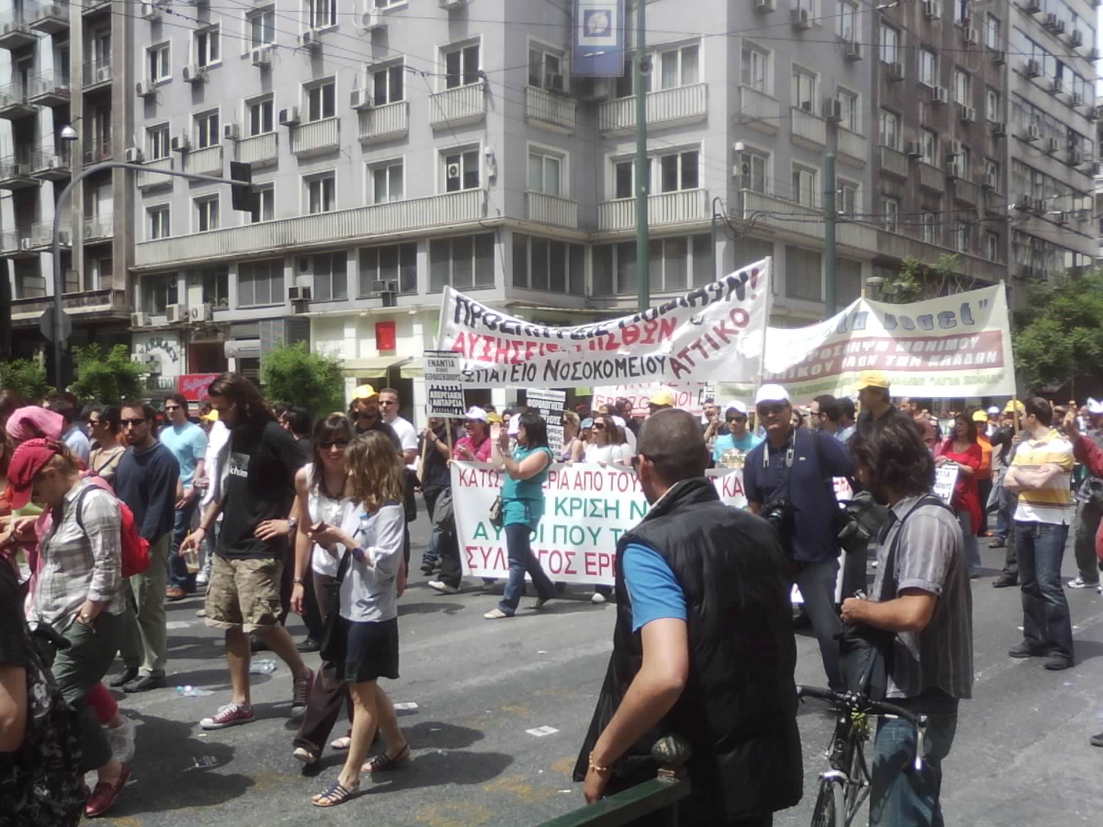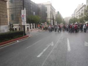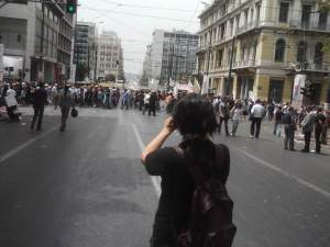 I joined the mayhem at around lunchtime, following one of several large demonstrations as it wound its way from Omonoia down the long avenues towards Syntagma Square. I was with the filmmaker Netalie Braun who, as an Israeli, has more experience of political demonstrations than me.