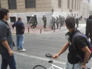 The police in turn threatened with tear gas. The crowd booed as a fleet of cops on motorbikes rushed in. An elderly man walked through the lines, calm as you like, distributing flyers and muttering to himself. Then, at the sound of a whistle, the police charged. Netalie and I ran in the opposite direction. At a safe distance, I called Yiannis. Breathlessly, he told me to leave immediately.
