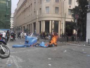 Whilst this march had an upbeat, almost Carnival atmosphere, with protestors drumming and chanting, the signs of violence were everywhere: in the smashed windows of shops, traffic lights torn open; the stone and marble frontages of buildings ripped up and chipped away for missiles. Fires raged in melting dustbins.