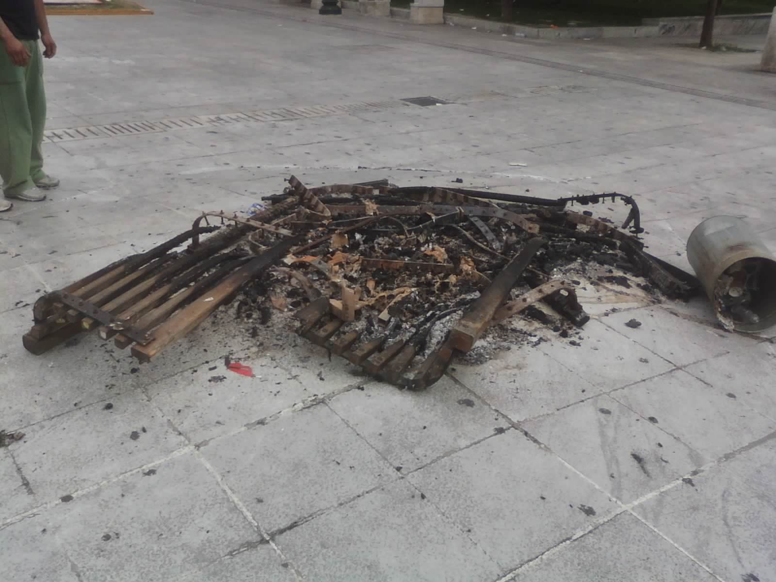 The wooden benches I’d sat on only two nights previously with Theo and Iliana had been ripped out and burnt.