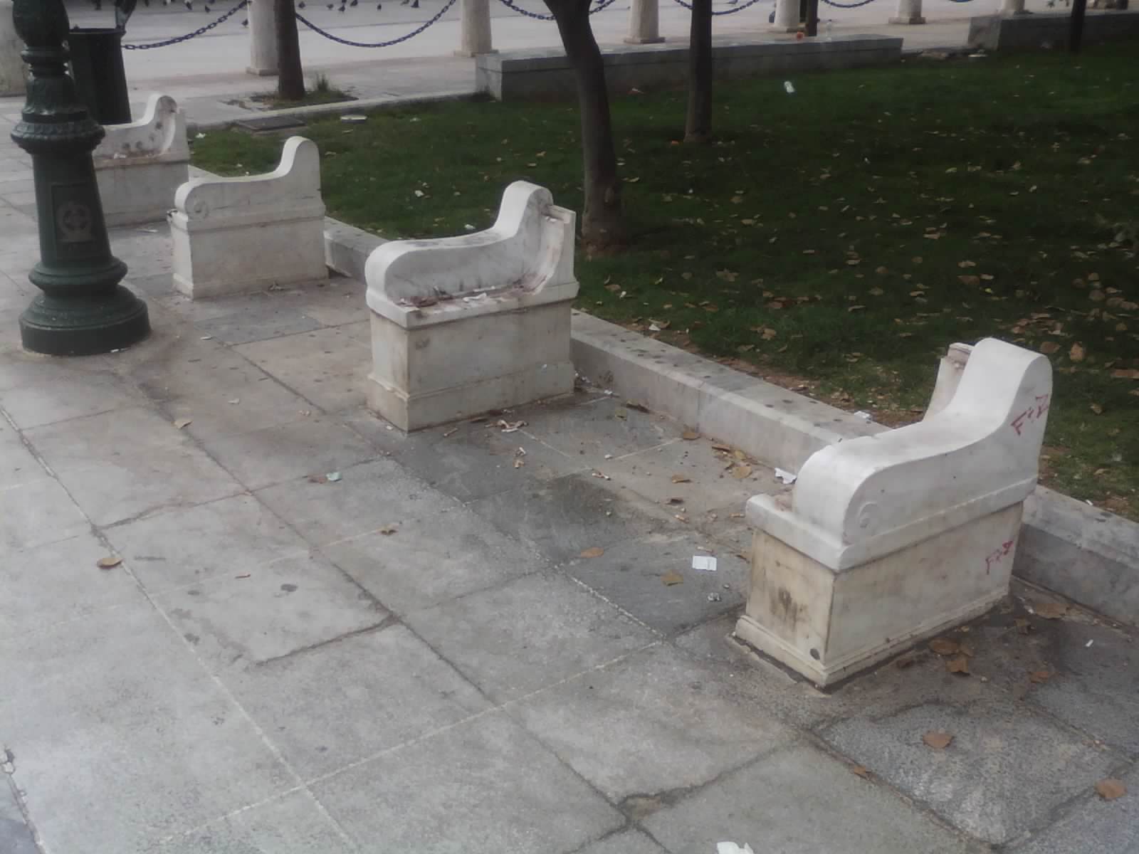 Outside the national library, a group of young anarchists were breaking off chunks of marble from a ledge with a hammer or small pickaxe. When one of them saw Netalie filming and me taking photos on my phone, he gave us a very sinister look and shook his head threateningly.