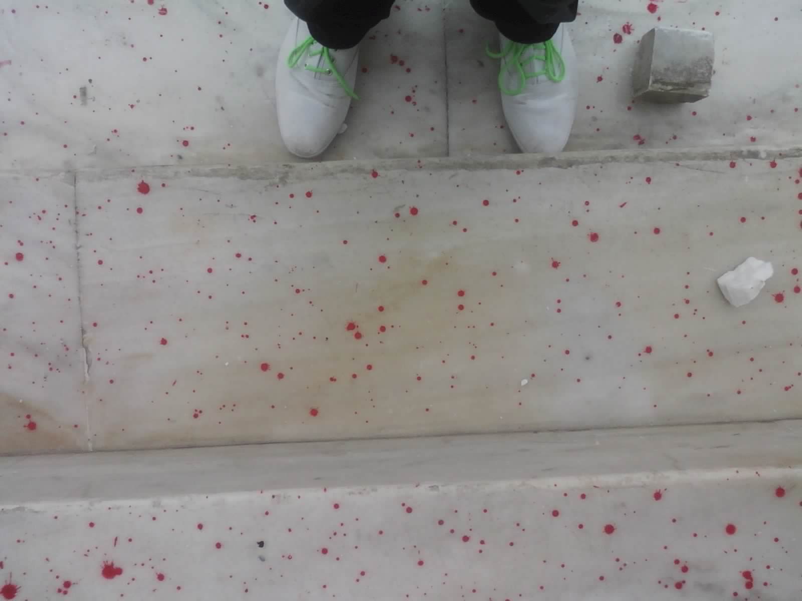 The steps of the National Bank of Greece were covered in red paint. The metaphor is clear enough.