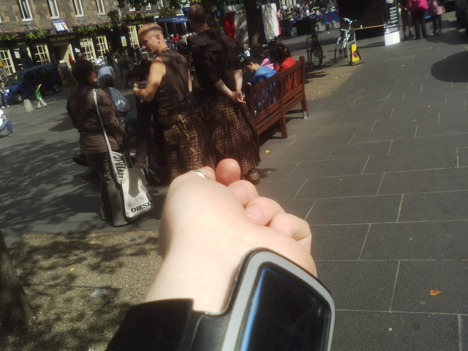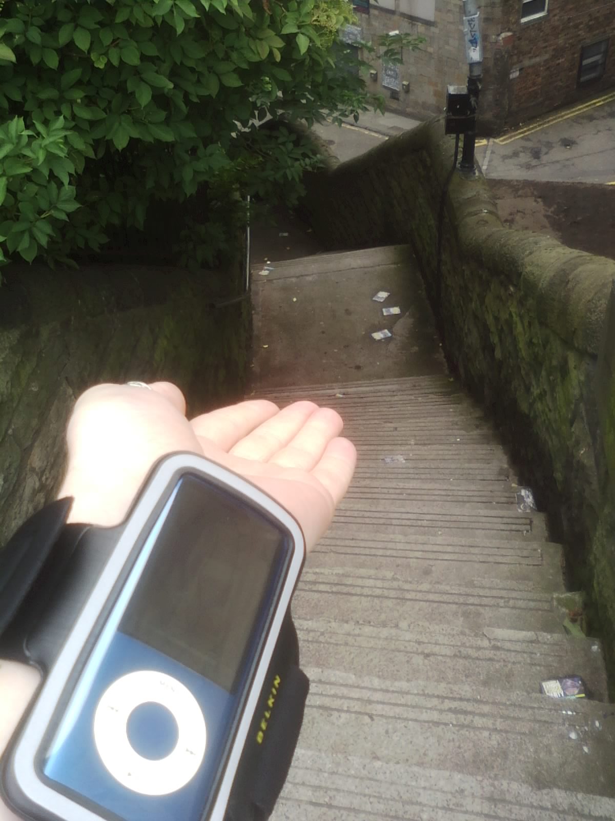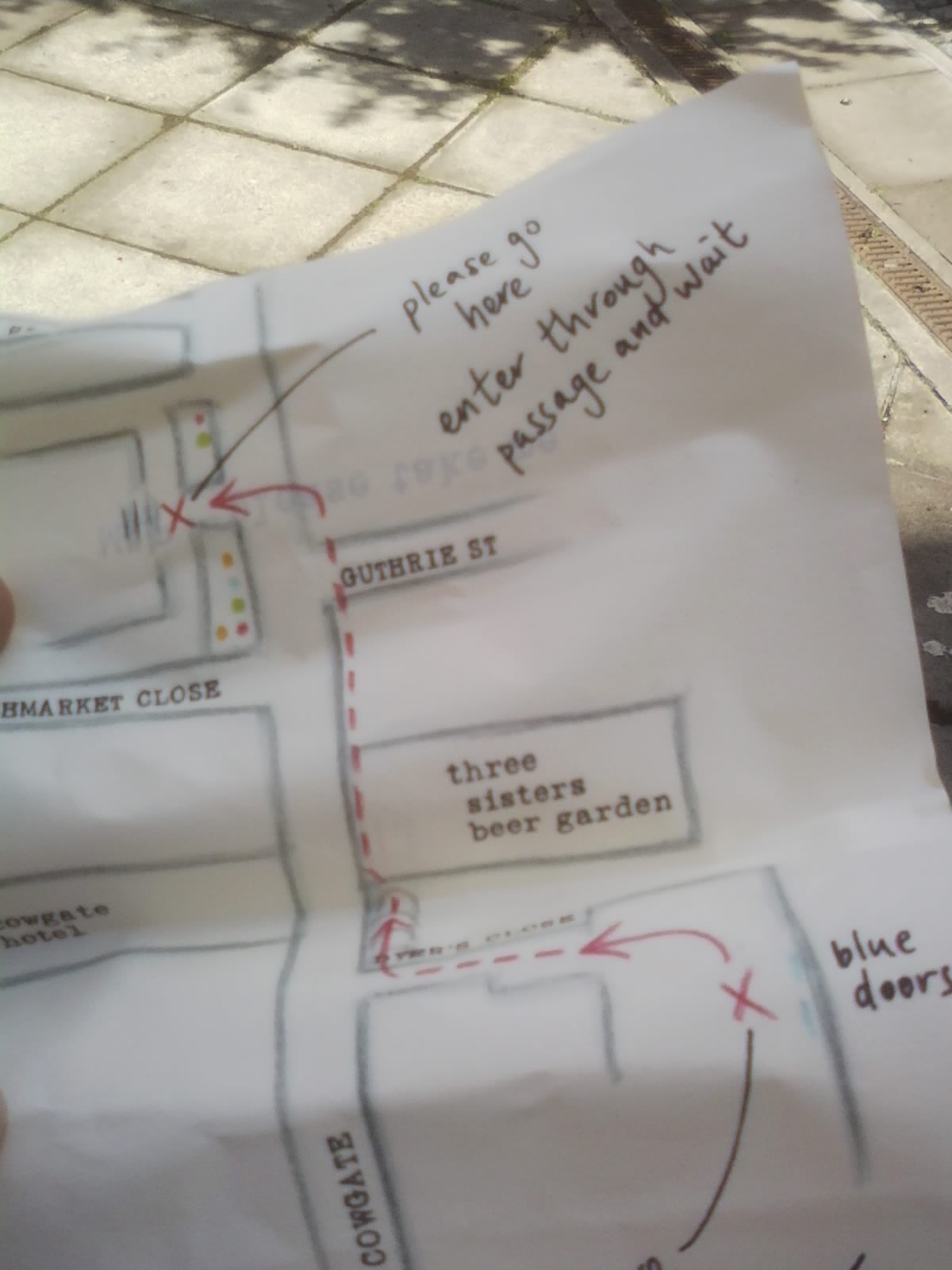 So, whilst I was in Edinburgh I took part in the site-specific walking tour of the city: En Route. The ‘show’ is the brainchild of Melbourne-based collective one step at a time like this. It goes like this. You meet in the foyer of the Traverse Theatre in a group of 2-3. Someone takes you half-way up the road, splits you up from the group, gives you a set of headphones, straps an iPod to your wrist, takes your mobile number, and tells you to cross the road, walk down a set of stairs and wait for further instructions. Orienteering, then, crossed with a treasure hunt, and with dashes of psychogeography.