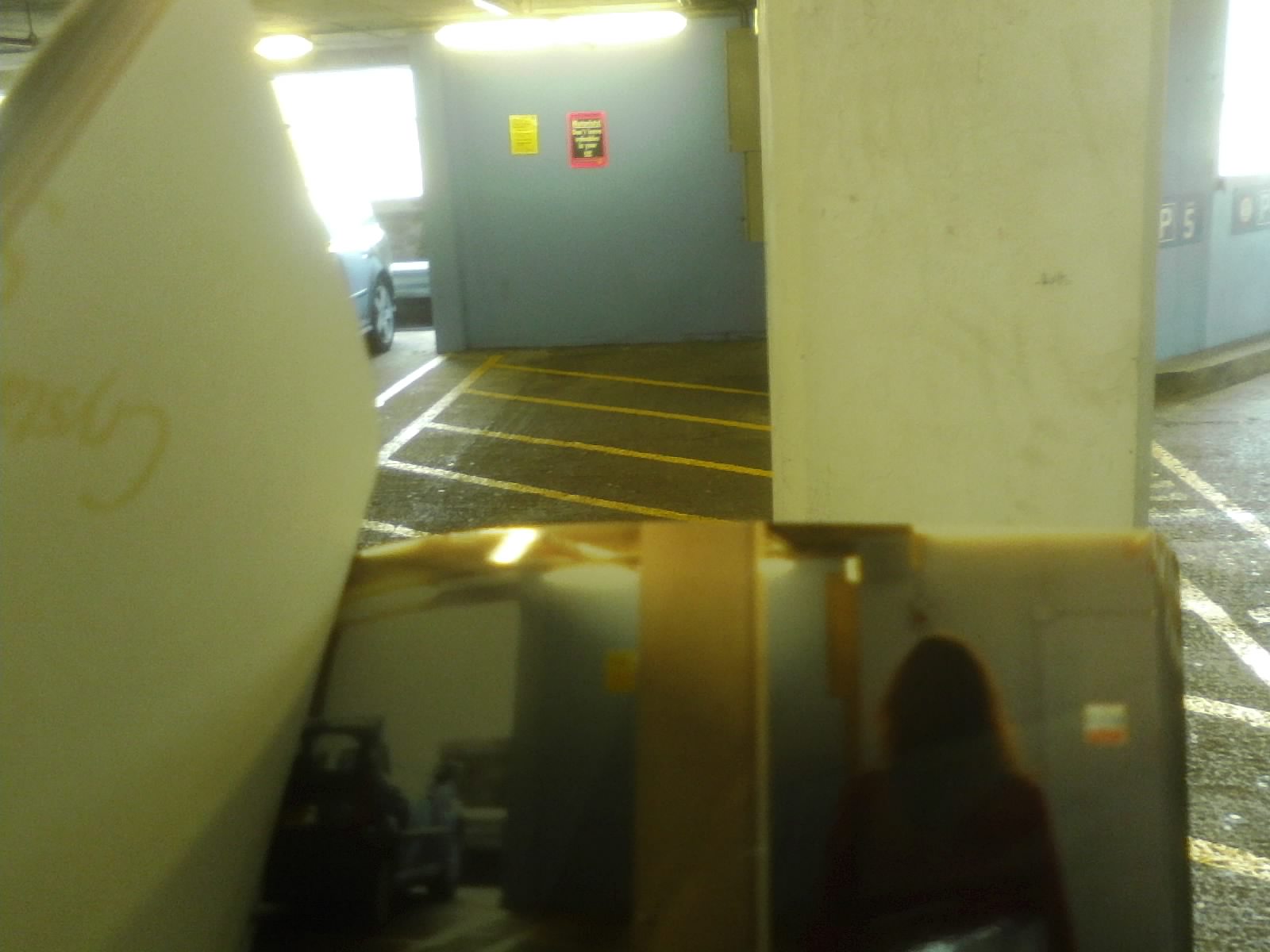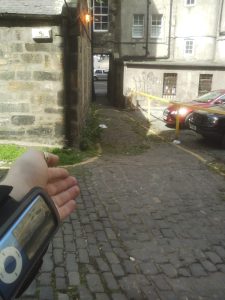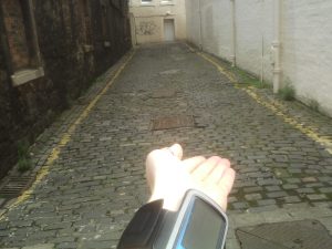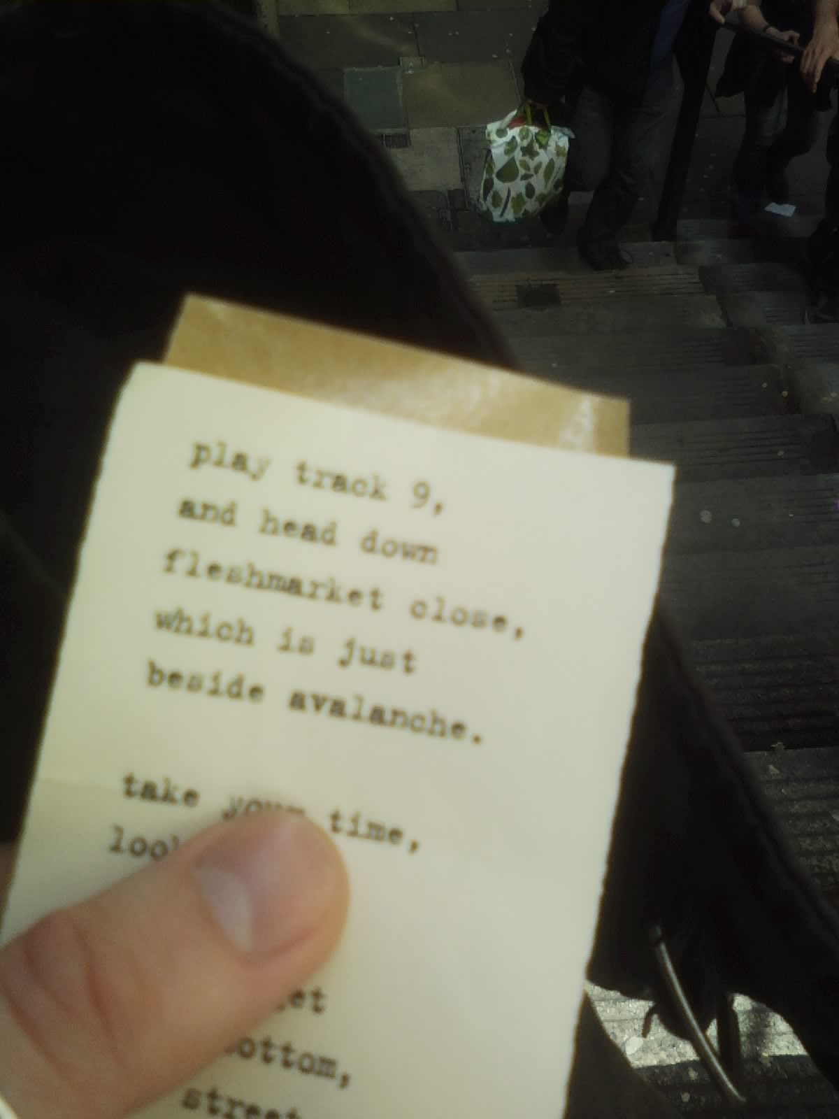 What follows is a 70 minute (?) tour of Edinburgh which leads you down dark alleys, across busy roads, into a Hotel lobby, a shopping centre, and up to the top of a multistorey carpark. Instructions are received as texts on your mobile phone, from the soundtrack on your iPod, are discovered in envelopes behind garage doors and in record shops, daubed in chalk on the increasingly slick pavements.