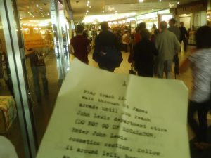 All the time you are being shadowed, discretely, by your ‘helper’ – ie. the person who fit your iPod/headphone gear. In my case, the shadowing was less than fluid as I failed to receive the first few instructions by text, meaning that I ended up hanging around rather aimlessly. I didn’t mind this though. In fact, it was the interaction with my ‘helper’ – as well as the sense you are being watched over – that gave this experience depth of meaning. I’m pretty au fait with psychogeography/Situationism/derives &c. so all that ‘looking at the city differently’ stuff, whilst fun and important, was hardly new to me.
